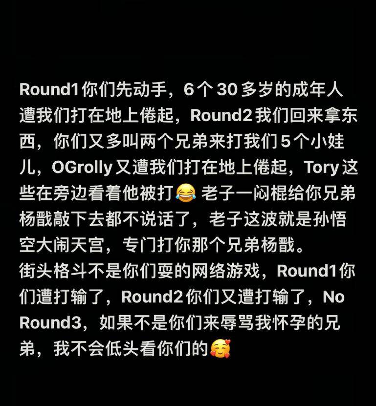 “Round1你们先动手,遭打输了,Round2你们又遭打输了,No Round3,如果不是你们来辱骂我怀孕的兄弟,我不会低头看你们的!”
