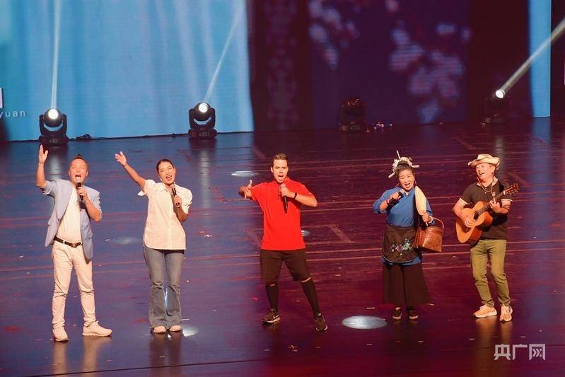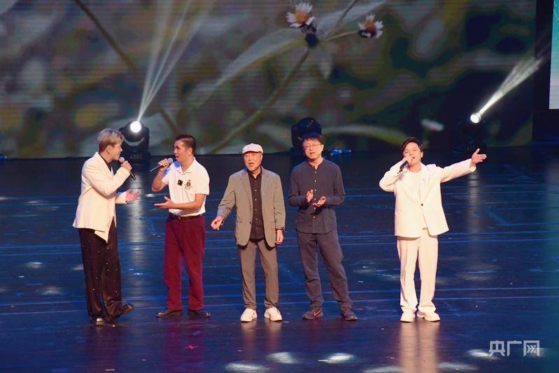 黄庆元(左三)和堂弟黄蒲旺(左二)与来自两岸的歌手同唱《把根留住》(央广网记者 龚雯 摄)