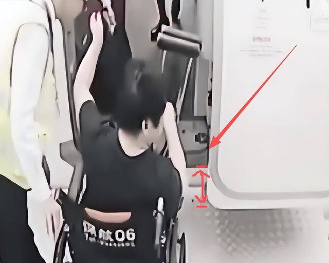等升降车到机舱门口时,确实有大概20厘米的高度差,轮椅的确不好上,但倘若他拄拐进去,也是很方便的。