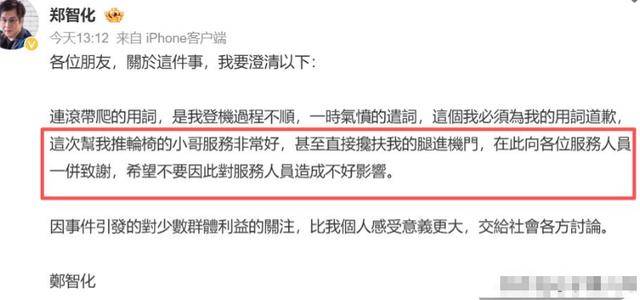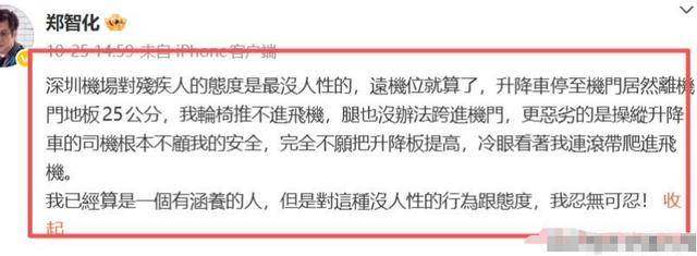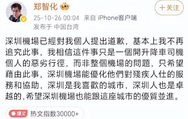 眼看舆论越演越烈,10月27日,郑智化扛不住了,他最终选择道歉,还发了条新内容说“感谢深圳机场工作人员的周到服务”。