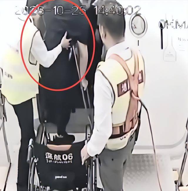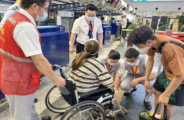 可他偏不拄拐,坚持选择轮椅。由于轮椅不好进,所以还没等他动手,两名地服、两名空姐还有一名机舱工作人员,五个人立马围了上来。