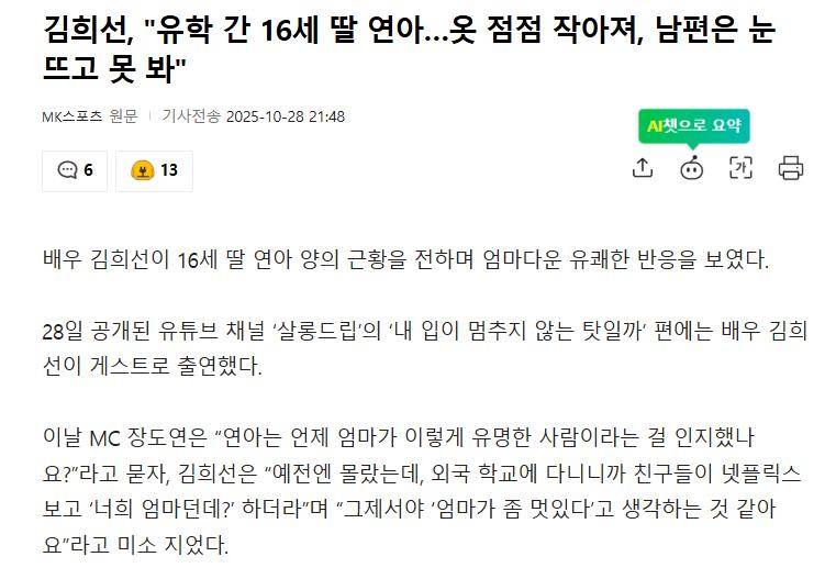 据韩国媒体10月28日晚间报道,演员金喜善在节目中聊起自家16岁留洋女儿的近况,一番“老母亲”的幽默吐槽,瞬间火上了热搜。