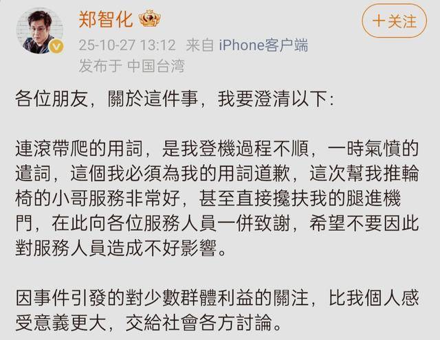 这次他道歉说:连滚带爬是我登机过程不顺,一时气愤说的话,我为自己的用词道歉。