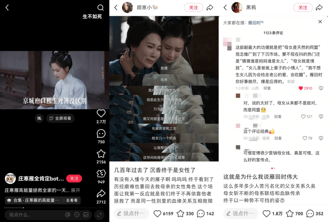 随后当剧情展开,小红书的第二轮repo和二创,往往就会围绕着剧中的一些人物、情节、议题展开。比如《雁回时》播出时,观众带入自身经历与剧中“母女线”共情,源源不断产出新锐先锋观点。