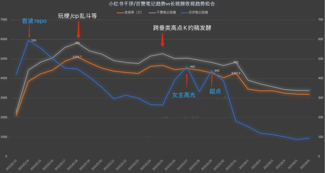 《折腰》小红书千赞/百评笔记趋势VS长视频收视趋势拟合