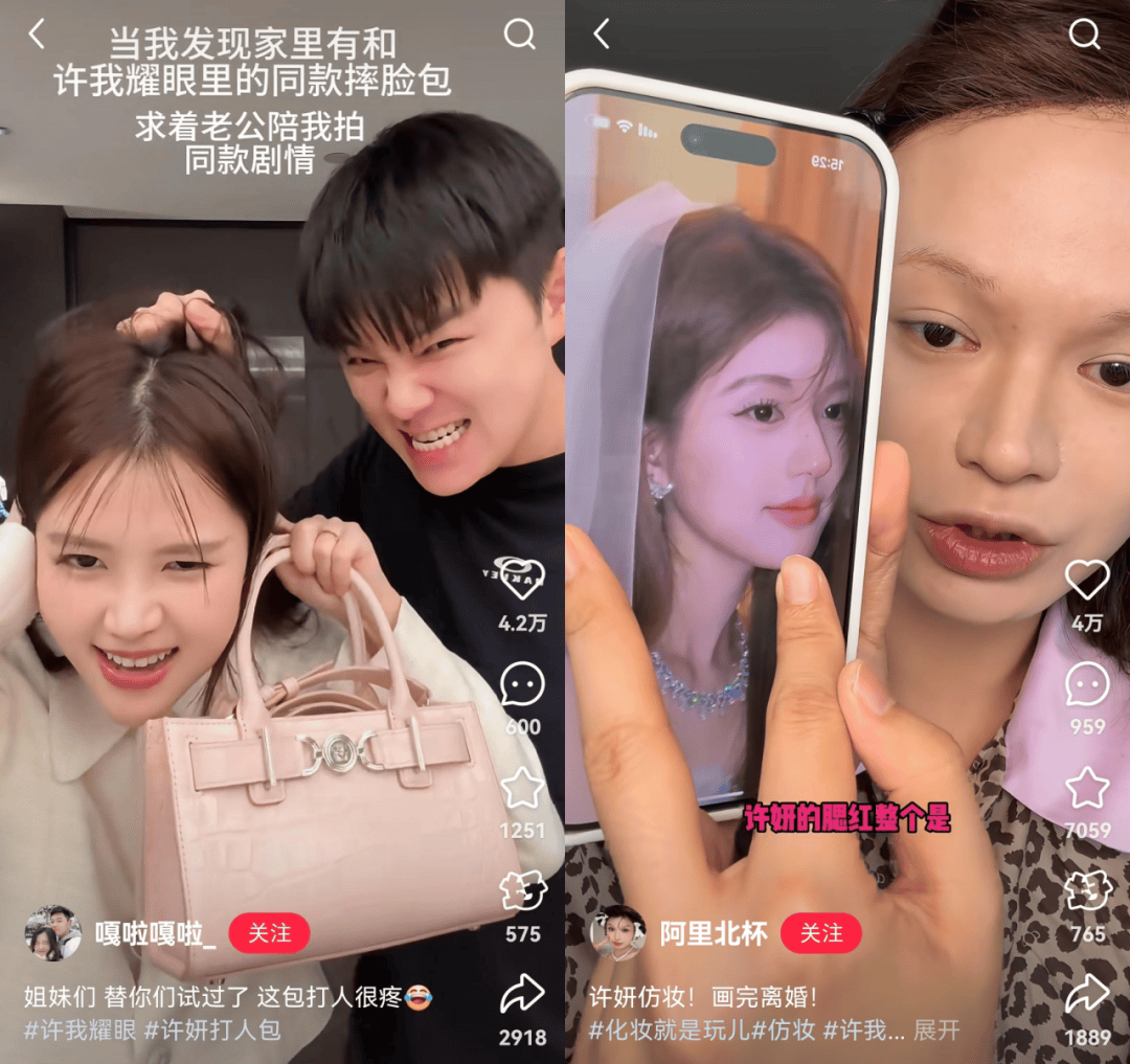 《许我耀眼》播出期间,时尚博主产出一系列“扒同款(衣服、包包、香水、美甲等)”视频,打造出“许妍生活展”。美妆博主则直接仿妆出街,将剧中的妆造美学带入现实。