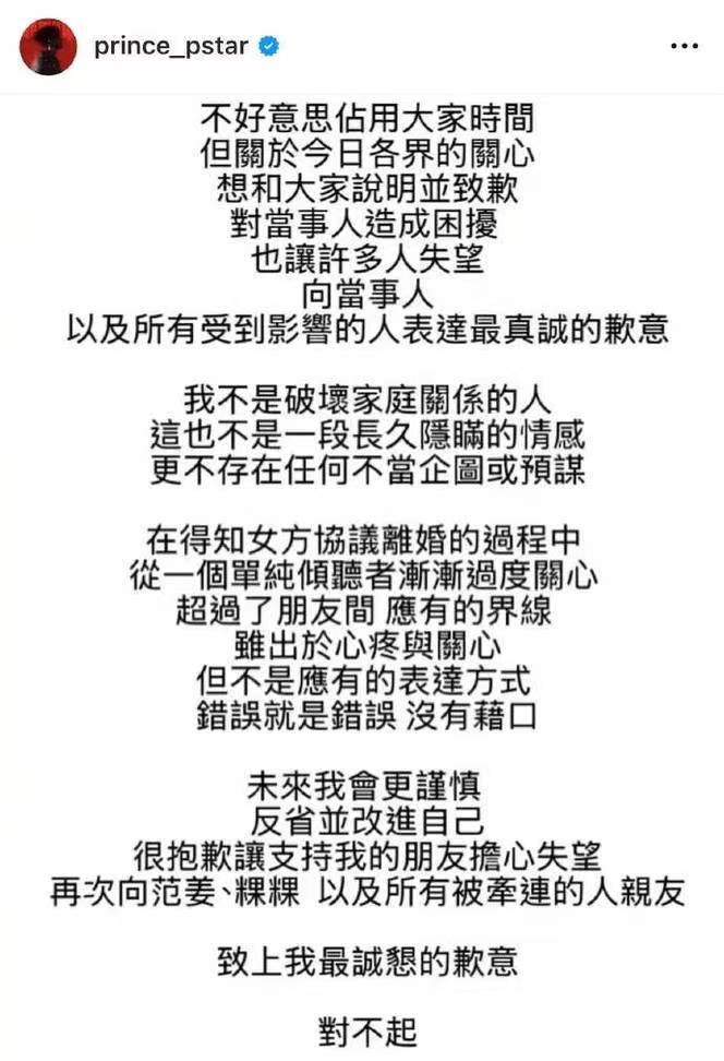 他不是破坏家庭关系的人,这也不是一段长久隐瞒的情感,更不存在单纯倾听者渐渐过度关心,超越了朋友间应有的界线,虽出于心疼与关心,错误就是错误,没有借口,未来他会更谨慎,反省并改进自己,很抱歉让支持他的朋友担心失望,再次向范姜粿粿以及所有被牵连的人亲友致上最诚恳的歉意。