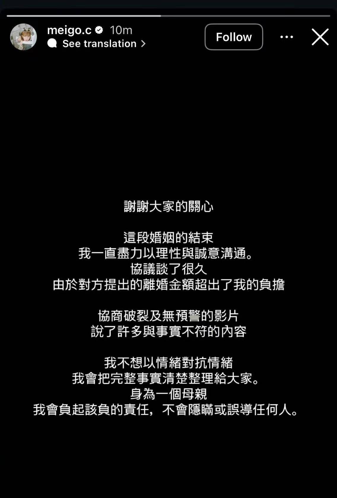 粿粿也回应了,表示这段婚姻的结束,她一直尽力以理性与诚意沟通,协议谈了很久,由于对方提出的离婚金额超出了她的负担,协商破裂及无预警的视频,说了许多与事实不符的内容。她不想以情绪对抗情绪,她会把完整事实清楚整理给大家,身为一个母亲,她会负起该负的责任,不会隐瞒或误导任何人。