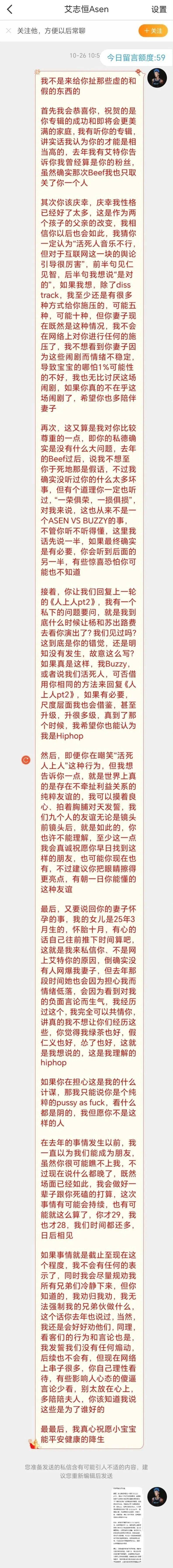 2.Buzzy走心谈“活死人音乐不行,但对于互联网舆论这一快引导很厉害”这句话,表示前半句见仁见智,后半句表示认可,并放话自己有很多种方式给Asen施压,但考虑Asen的妻子,自己不会这样做。