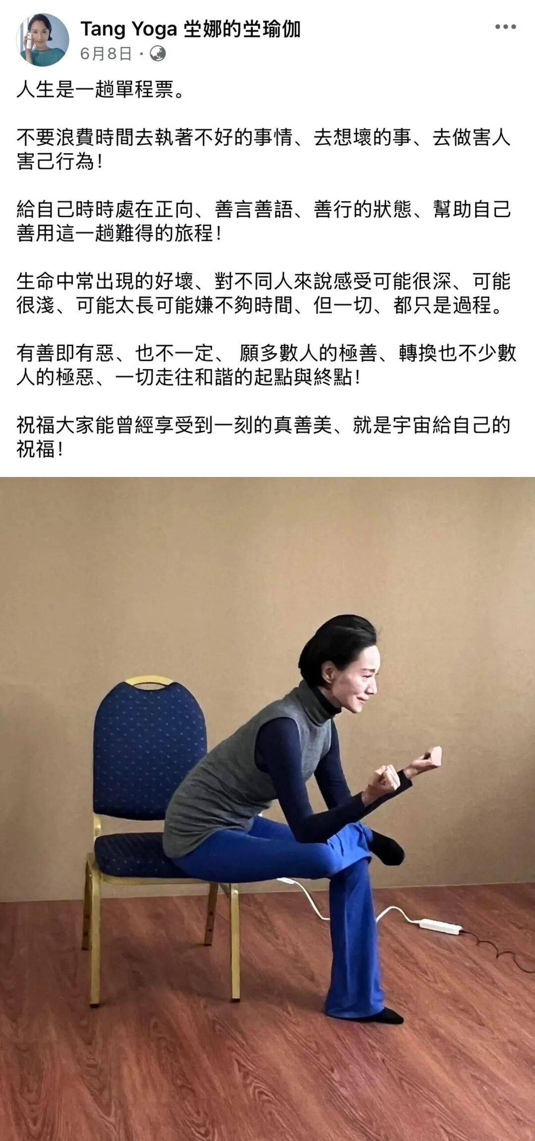 近年,她鲜少公开露面。她的社交账号的最后动态发表于6月8日,她写道:人生是一趟单程票。不要浪费时间去执着不好的事情、去想坏的事、去做害人害己行为!给自己时时处在正向、善言善语、善行的状态,帮助自己善用这一趟难得的旅程!生命中常出现的好坏,对不同人来说感受可能很深、可能很浅、可能太长可能嫌不够时间,但一切都只是过程。