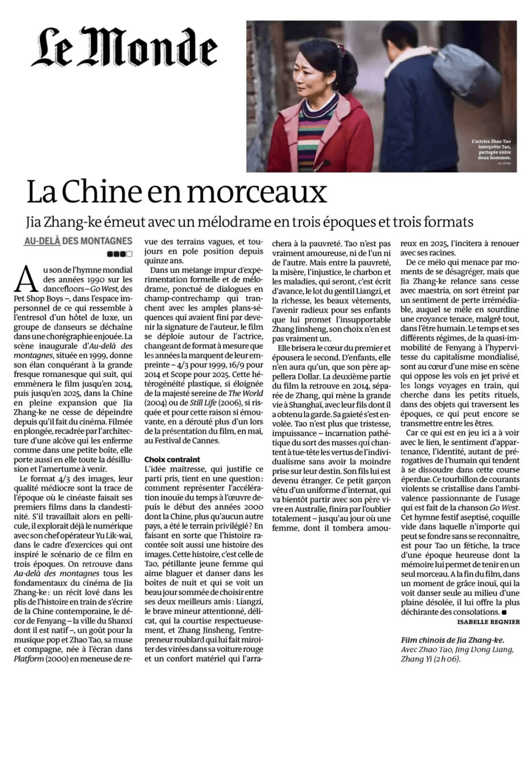 在去年年底举行的,本片在法国进行了特别展映。贾樟柯是法国观众最为熟悉的中国导演之一,他的新片《风流一代》已于2025年1月8日在法国公映。