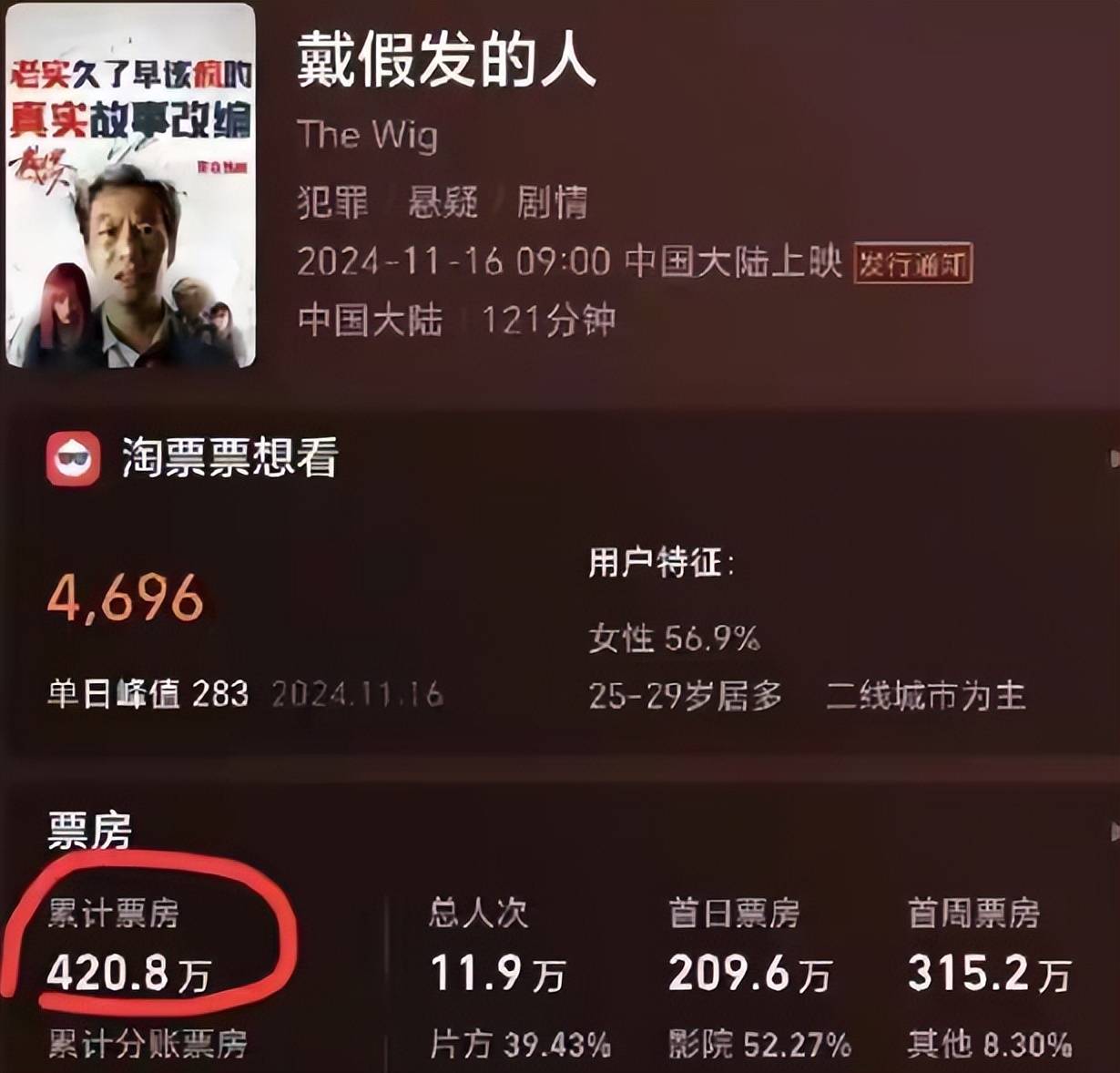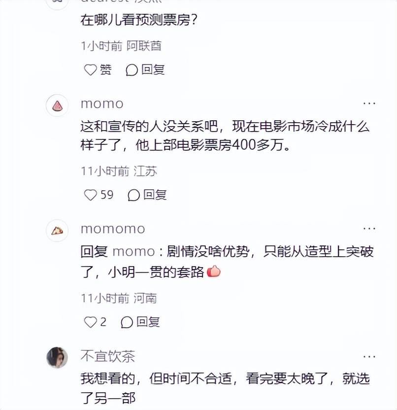 离开他的评论区,再看看真实的电影票房数据,就会觉得反差感特别强,这电影上映两天几乎没有一点口碑起色,预测总票房还不到一千万。