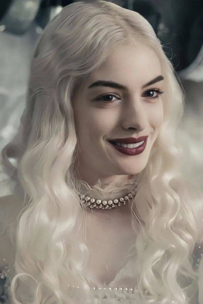如果说用深色造型渲染角色暗黑力量,那安妮·海瑟薇饰演的白皇后就是反例。她穿着精致的珍珠礼服,神情温柔,声音轻缓,却感觉美丽的微笑中藏着“不善惹”的杀气。