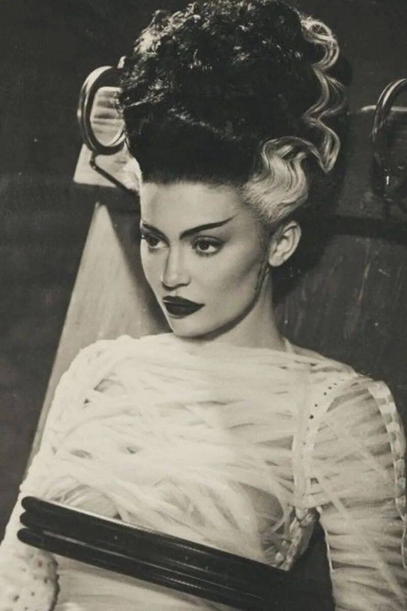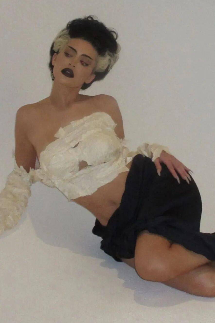 Kylie的《科学怪人》的新娘造型走的就是彻底的叛逆路线。凌乱却结构分明的束缚式衣装、黑白分层的蓬松卷发、夸张的上挑眉形,以及深到近乎黑色的唇妆,戏剧性拉满。