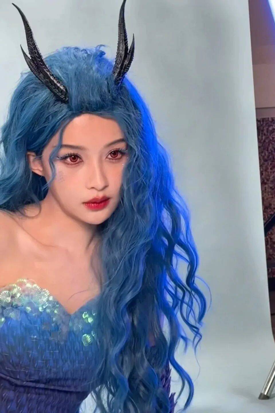 直接还原角色也是个不错的选择。孙怡在综艺上的敖闰造型火出圈,妆容以“深海神秘感”与“龙族气场”为核心,复刻了《哪吒2》中龙姑姑带有的红色美瞳与蓝色眼妆精髓。