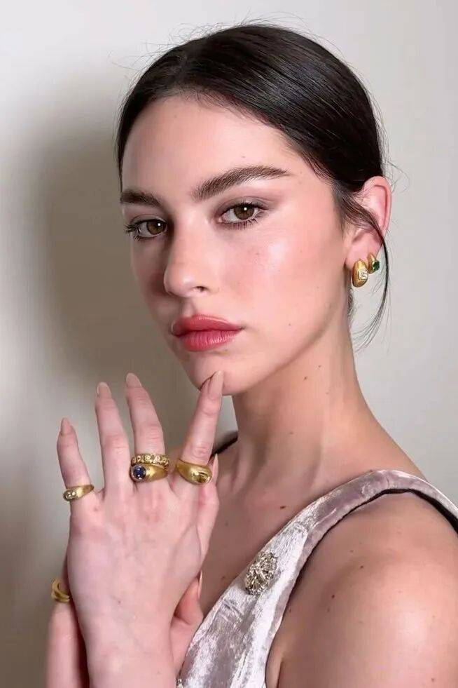底妆不刻意完美:略带质感的雾面妆容更贴合复古气质。