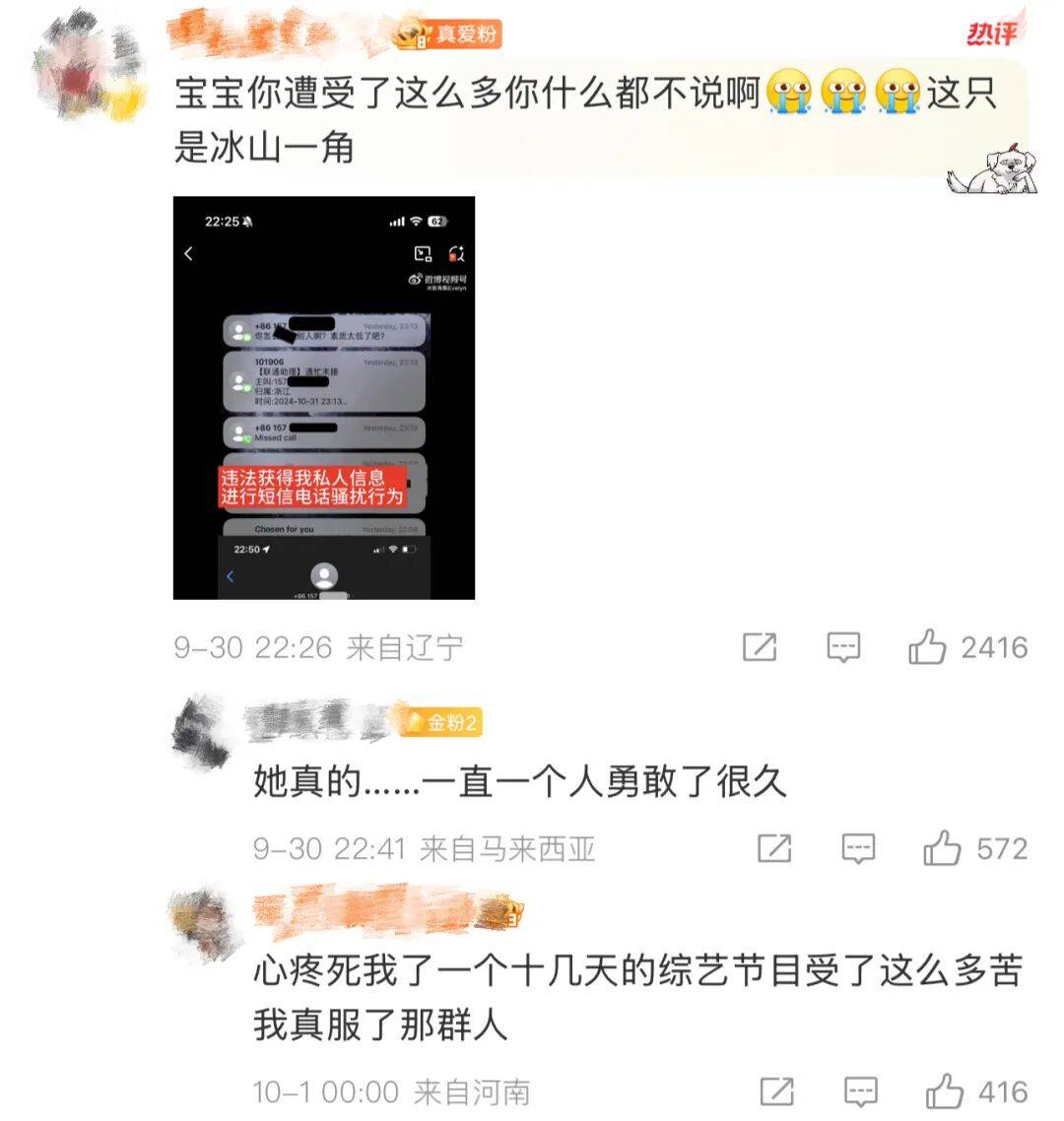 除粉丝外,粉丝本来就心疼她被网暴,一看她po出的那些骚扰短信、骚扰电话,更是觉得“在我们看不到的地方,你遭遇的恶意只有更多”,纷纷在评论区力挺,表示“正义虽迟但到”。