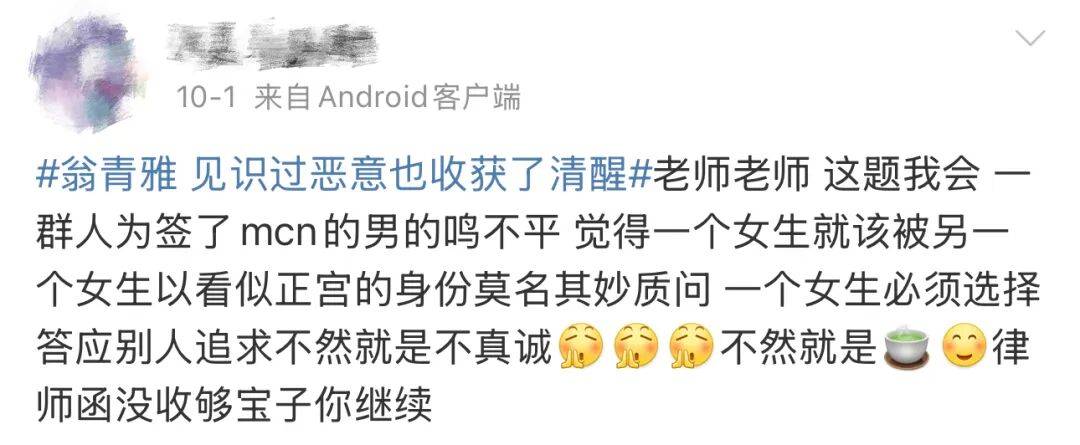 该说不说,翁青雅的死忠粉是真不少,始终秉持“女生有拒绝别人的权利”的观点,哪怕外界质疑声再大,也打心底里觉得她没做错。