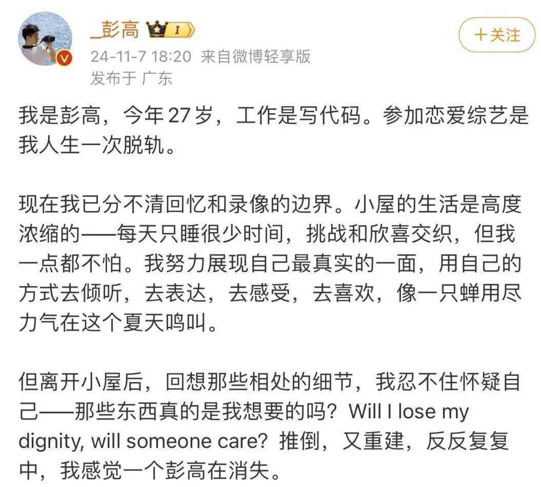 眼看着节目开播热度起来,才想着回头找人家配合炒cp,这还说啥啊,彭高压根不买账。