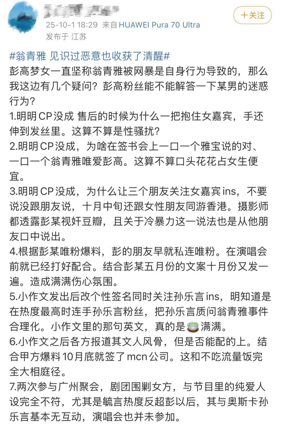 有人吐槽翁青雅欺骗cp粉感情,粉丝就强调彭高当初也没少发糖配合;有人质疑她上恋综就是为了出道,粉丝就调转枪口,这边攻击彭高接广告,那边阴阳孙乐言才是节目后商务不断的那个。
