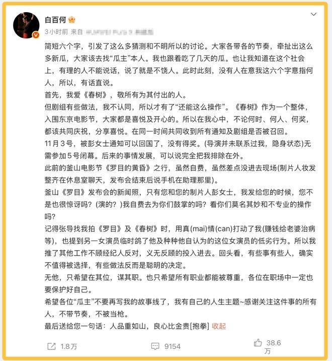 白百何在社交媒体上,正式斥责《春树》制片人彭瑾和导演张律。