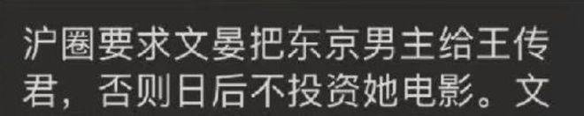 很离谱的一条谣言,说“沪圈要求文宴把东京男主给王传君,否则日后不投资她的电影”。