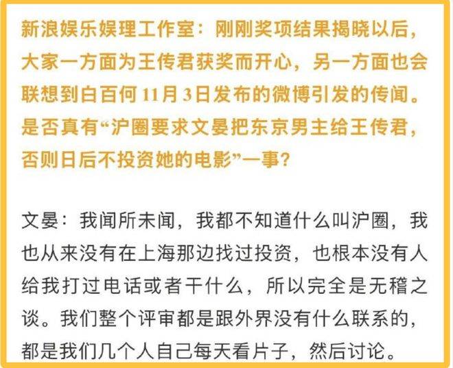 在谣言中被所谓“沪圈”胁迫的文宴导演,也就是这次的评审之一,在娱理工作室的采访中回应“我闻所未闻,我都不知道什么叫沪圈,我也从来没有在上海那边找过投资,也根本没有人给我打过电话或者干什么,所以完全是无稽之谈。我们整个评审都是跟外界没有什么联系的,都是我们几个人自己每天看片子,然后讨论。”