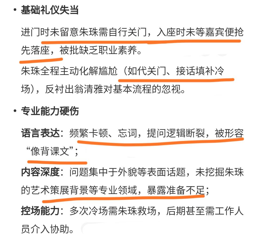 有网友列举翁清雅的“失误”,说她抢着进门,抢着落座,提问卡壳,问题没有深度,多停留在表扬朱珠的美貌层面。