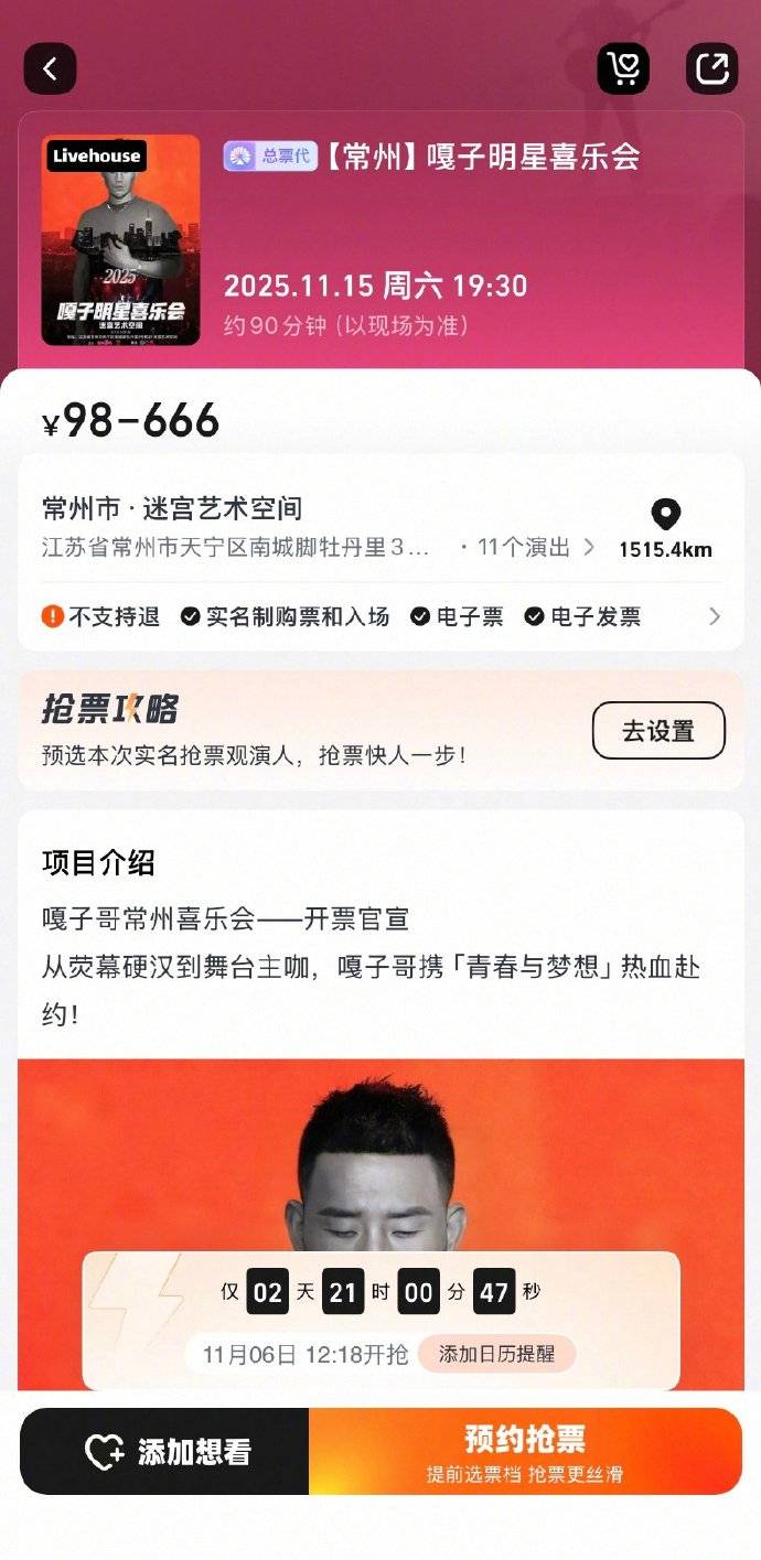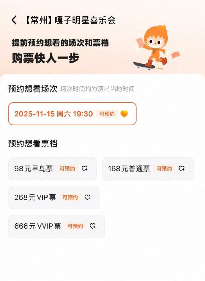 据购票平台信息,这场喜乐会票价分98元、168元、268元和666元四档。光买票还不够,想要更进一步的“互动”还得加钱:支付268元可获得“1V5合影”机会,而最高档的666元,则能获得嘎子本人亲自出镜的“1V1祝福视频”。演出规模限定900人,看来走的是“小而精”的路线。