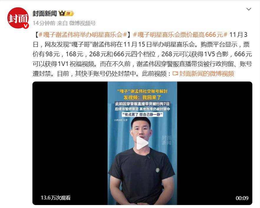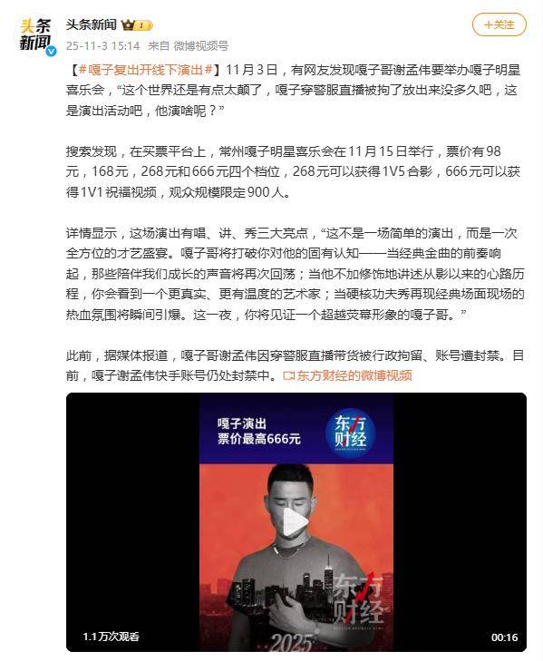 最近,“嘎子哥”谢孟伟又要搞大动作了——宣布将于11月15日举办“嘎子明星喜乐会”。此消息一出,立刻让围观网友直呼“看不懂”,毕竟,他不久前才因身穿警服直播带货被行政拘留,快手账号至今仍处于封禁状态。