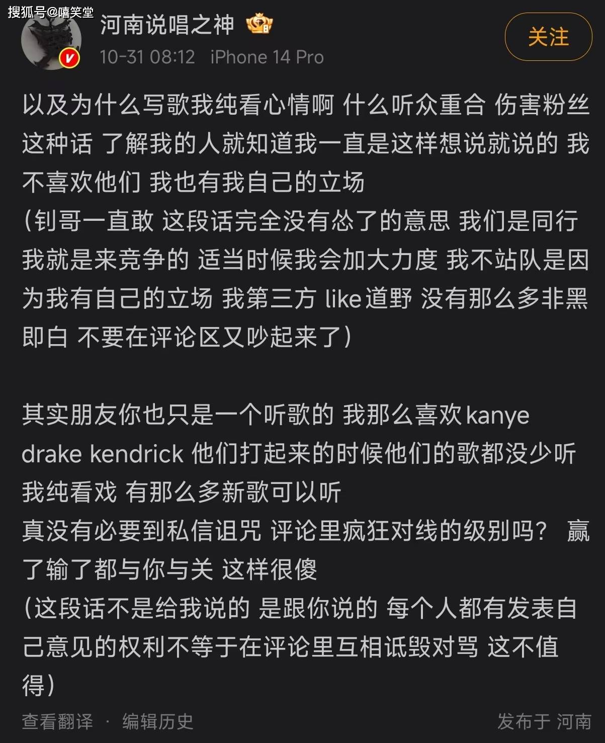 但和其他人不同的是,河南说唱之神表示并不站队,他想说的是别的东西。