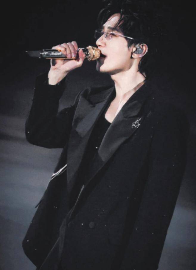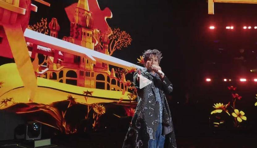 伴随着几段演唱会的闪耀片段,最后他穿着花哨的黑色花纹打底的衣服出现,整个人看起来精神十足。