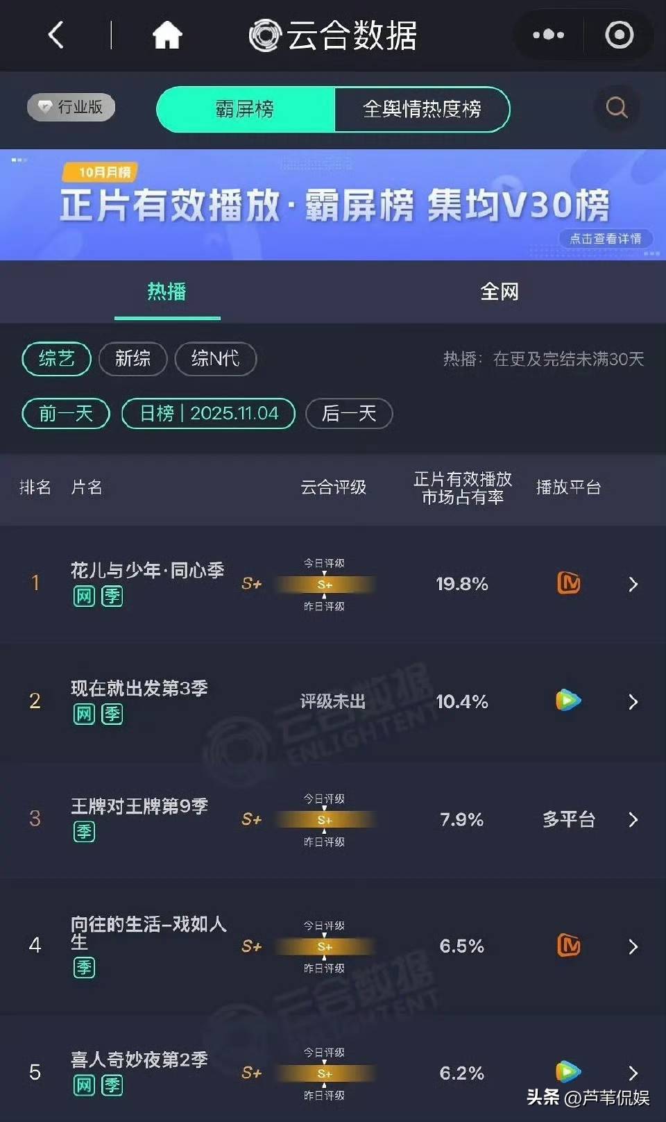 云合数据也印证了这一点,在《花儿与少年7》收官时,其热度数据达到了19.8%的高峰。对比同时间段播出的另一档综艺《快乐再出发3》,尽管同样受到关注,但其云合数据仅为10.4%。这不仅反映出《花儿与少年7》的受欢迎程度,也进一步证明了它的高收视成绩。