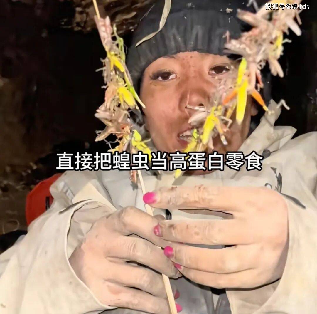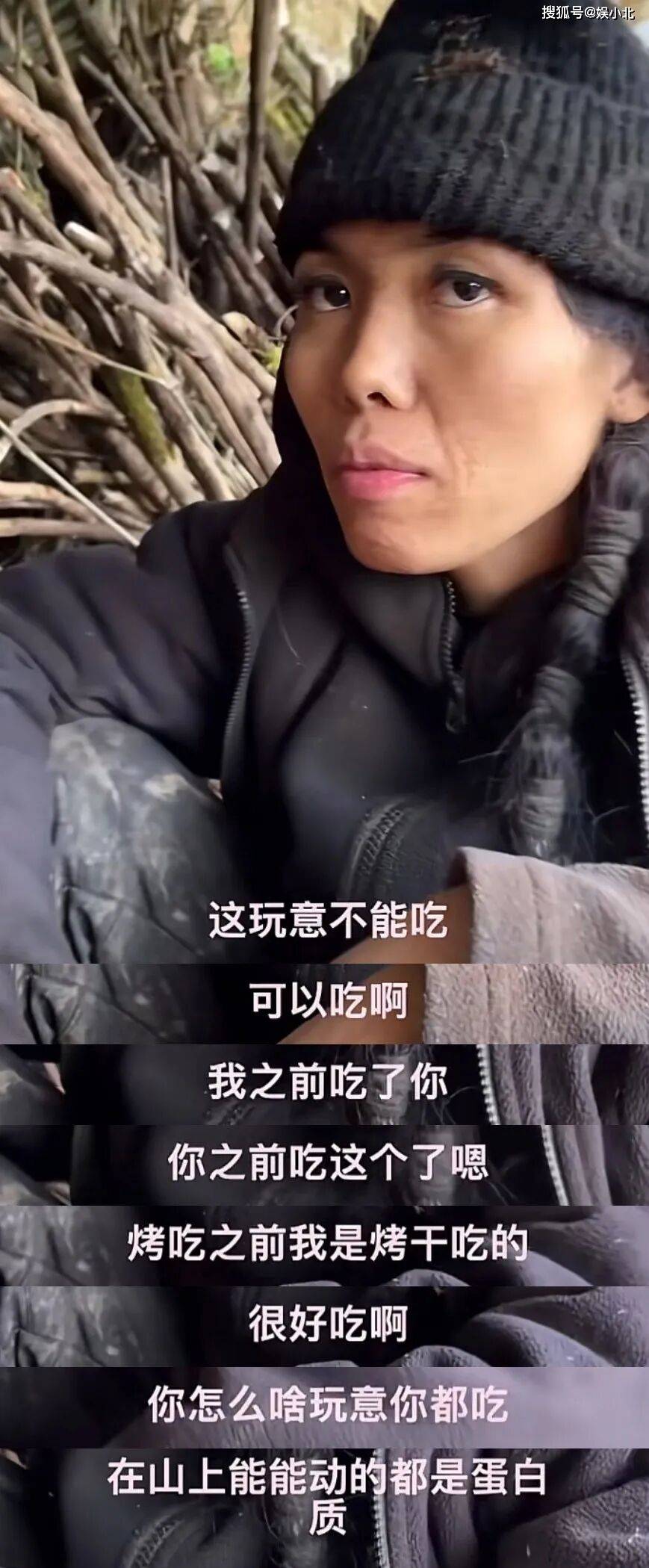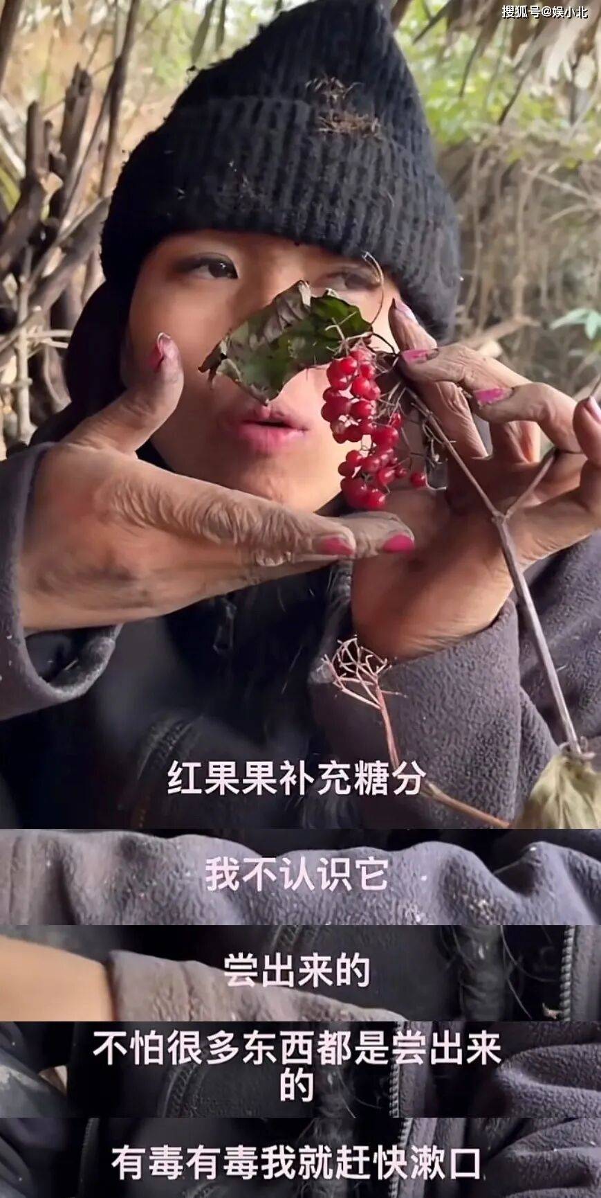 一开始可以怀疑她没有本事全靠饿,但30天过去了,她却把自己养的越来越好,虫子、野菜、野果嘎嘎往嘴里炫,这是真猛。