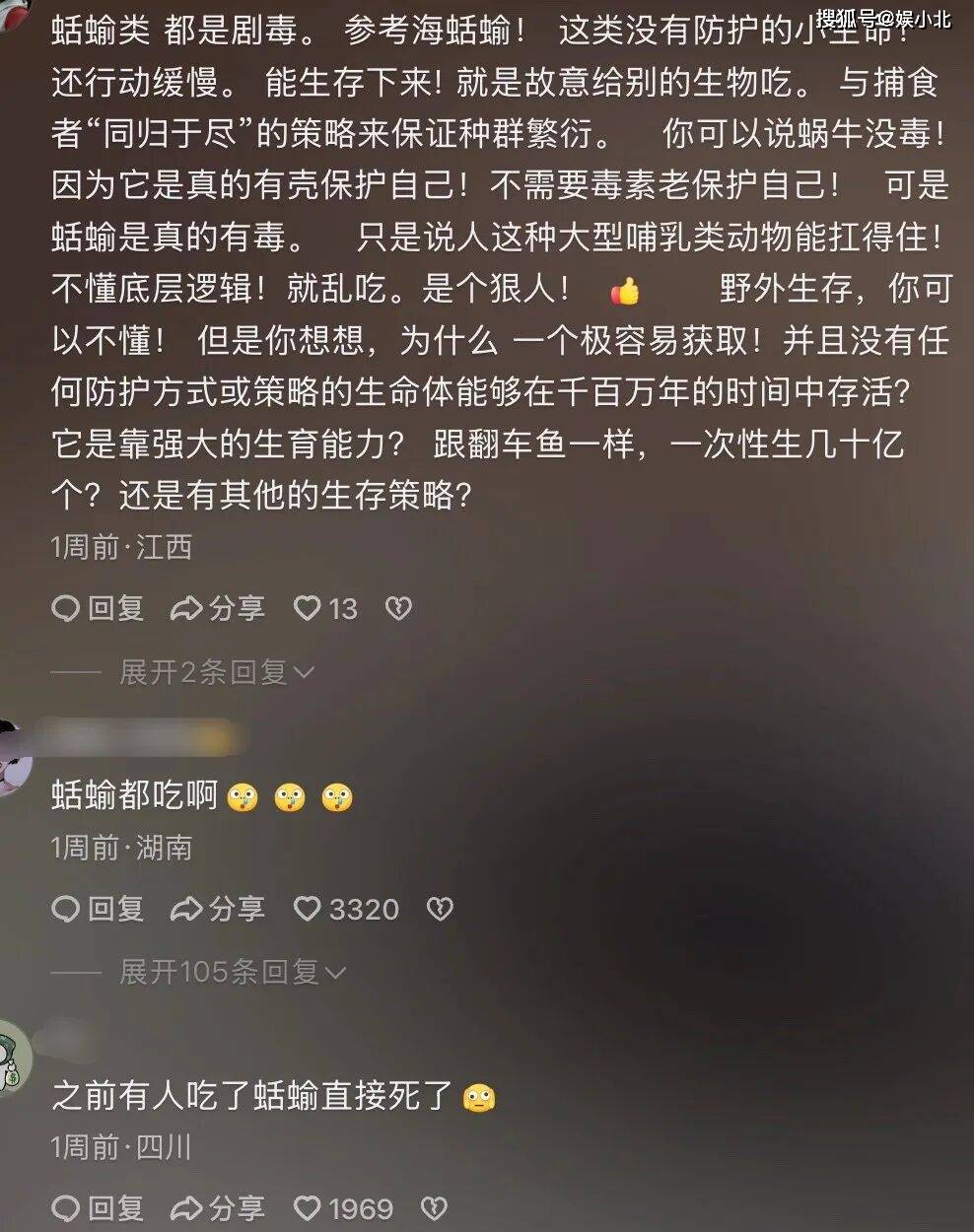 为了佐证蛞蝓不能吃,网友给出个人见解:一个没有防御,没有速度,没有攻击力还能生存的生命体,是如何在残酷的自然竞争中生存下来的?只有一种可能是有毒。否则,早被当成美食上桌了。