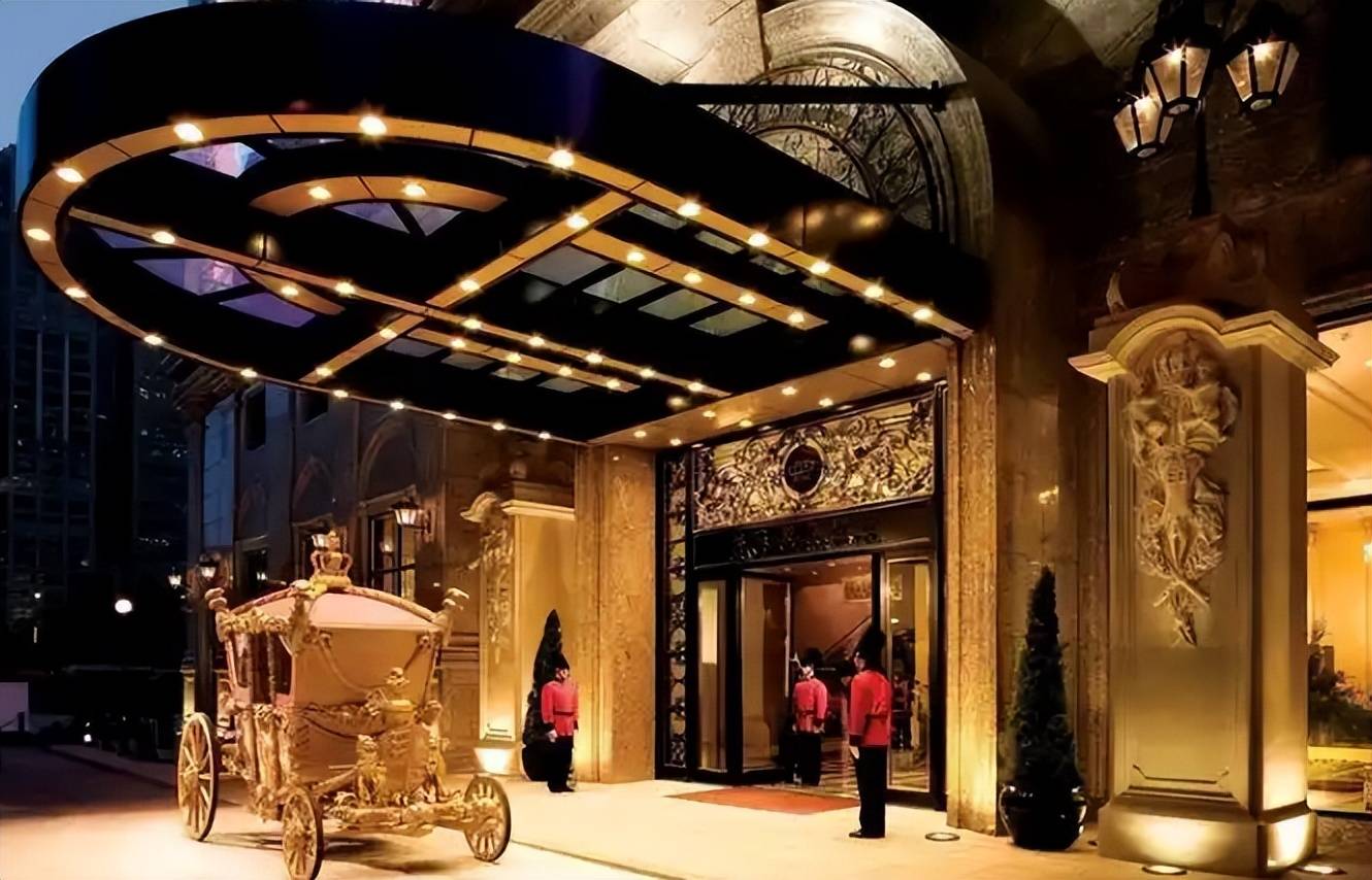 英皇宫殿装修从物理层面上做到了金碧辉煌,门口摆放着一辆镀金的和英国女王同款的马车,大厅主通道下内嵌78块金砖,每块足有1斤重,意为“步步生金”。