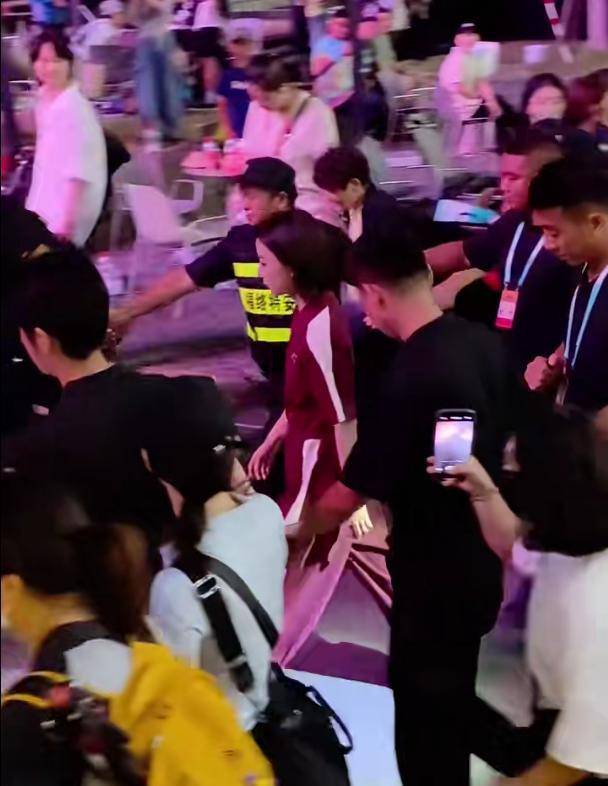 入场时,她在众多安保人员护送下进入场地。