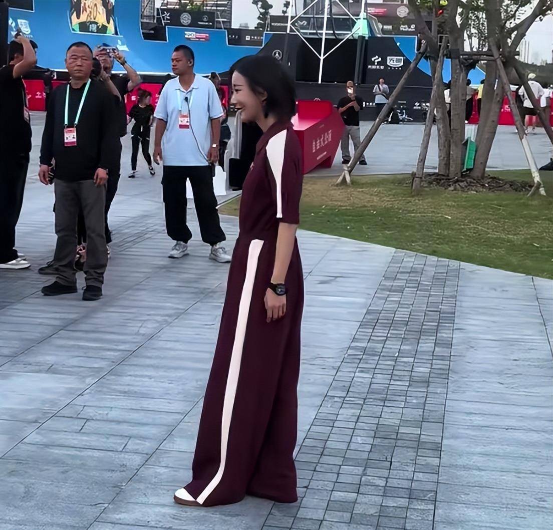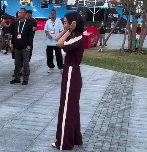 此次观赛也体现了她的个人兴趣。她选择的中性运动装扮显得十分利落。