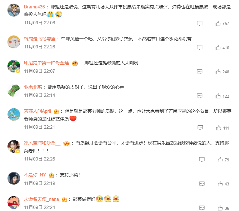 所以,虽然那英点评也不专业深刻,但好在胆子大,喜欢说话,于是每对比赛点评几乎都是她在那咋咋呼呼自我表演。唯独做对了一件事,就是质疑现场观众打分公平性,这是很多年观众都吐槽湖南卫视选秀的槽点和一点。
