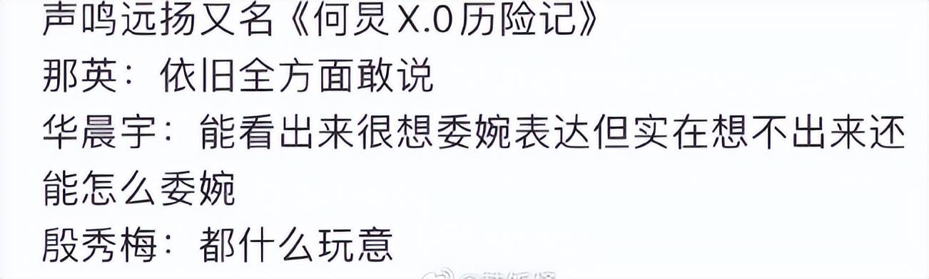 未经允许不得转载: 浩江娱乐网 » 原创 《声鸣远扬》评委尴尬,华晨宇殷秀梅语塞,那英话不投机拆台何炅