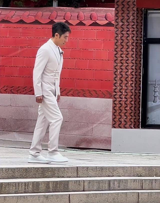 画面中撒贝宁穿着白色新中式西装,发型也梳的很精致,与身边穿着随便的工作人员形成鲜明对比。
