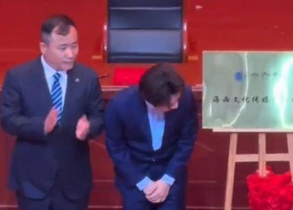 在隆重的揭牌仪式上,王祖蓝身着笔挺的蓝色西装,脚上的皮鞋擦得能照出人影。可就在鞠躬致谢的紧要关头,这位新晋教授自己先破功笑场了。这一幕被镜头逮个正着,让人不禁想问:这是开心的笑,还是心虚的笑?