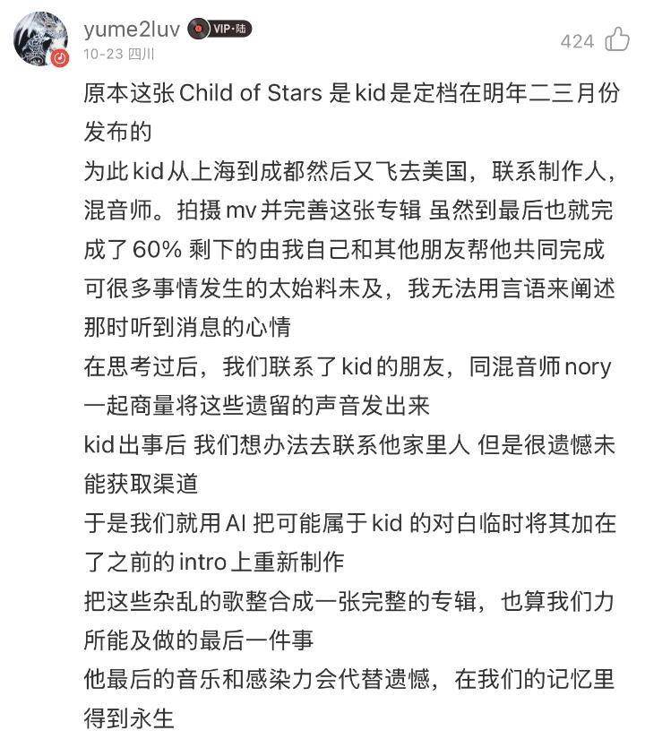 但事情太突然,就联系了Kid的朋友和混音师一起商量将遗留的声音发出来,在记忆里得到永生。