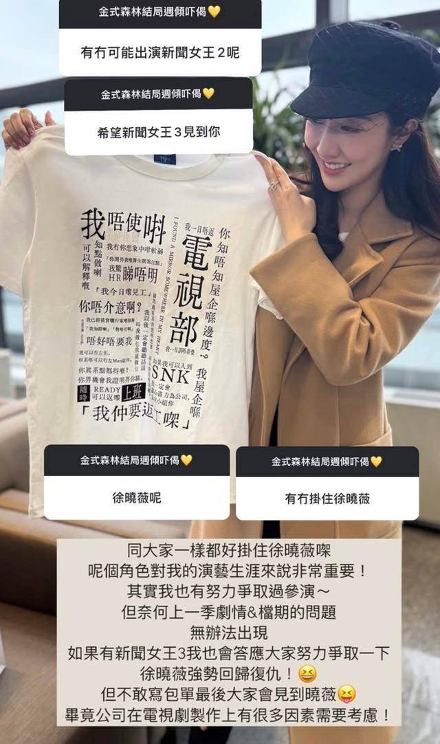 除了宣传《金式森林》之外,网友们也有问道,最近热播剧集《新闻女王2》中,为什么没有何依婷的演出。