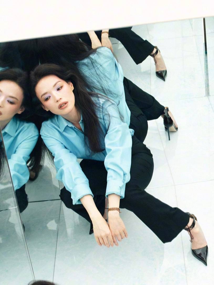 舒淇蓝色衬衣配黑色西裤,魅力四射。
