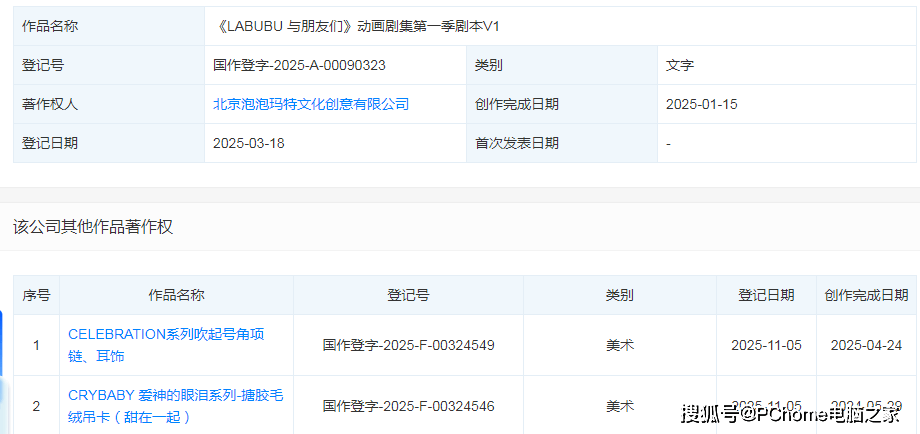值得注意的是,今年1月份,泡泡玛特已正式成立电影工作室,申请登记了《LABUBU与朋友们》动画剧集第一季剧本V1作品著作权。LABUBU系列拥有着庞大的家族族群,大首领ZIMOMO、成员MOKOKO、TYCOCO、YAYA、SPOOKY、PATO等,将在《LABUBU与朋友们》动画剧集中出现。