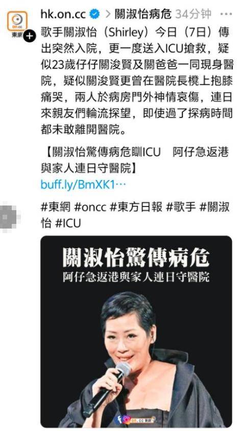 在十月七日,据港媒报道,关淑怡病危被转入ICU抢救,儿子和爸爸一同现身医院,