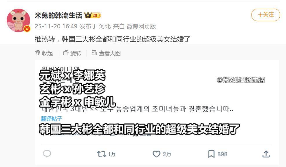 11月21日,“韩国三大BIN都娶了大美女”的话题刷屏,瞬间点燃了网友的八卦之魂。所谓“三大BIN”,指的是三位名字带“彬”(韩语发音为“bin”)的顶级男演员——元斌、玄彬、金宇彬。巧的是,这三位男神的配偶,清一色是韩国演艺圈公认的颜值与实力并存的女演员,堪称“顶配婚姻模板”。