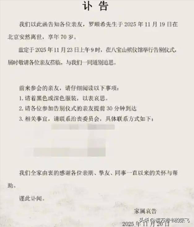他宣布罗晋的父亲罗顺希先生于前一日在北京病逝,享年70岁。
