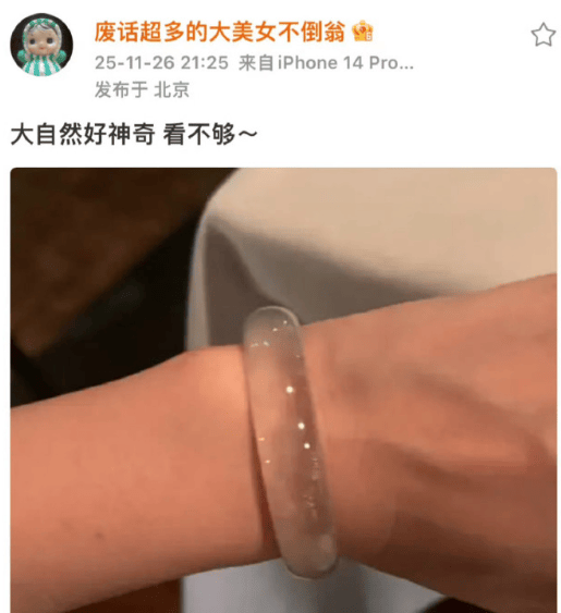 晚晚紧接着再来一篇,拍了自己的翡翠镯子夸大自然好神奇。
